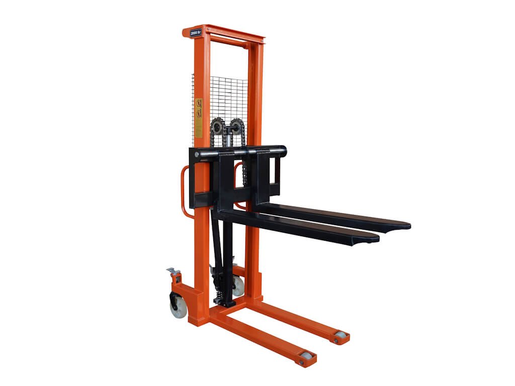 Вилы поднимаются за счет цепной передачи и мощного гидравлического цилиндра, которые приводятся в движение ручным рычагом с рукояткой переключения режимов или складной ножной педалью.